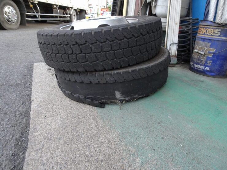 996ご納車途中、積載車が中井でバーストです。内側がバースト。 恐らく原因は外側のパンクで内側一本で走ってたようです。熱が入り内側バーストです スペア降ろして、後ろ一本で、996を逆積みしてご納車しま